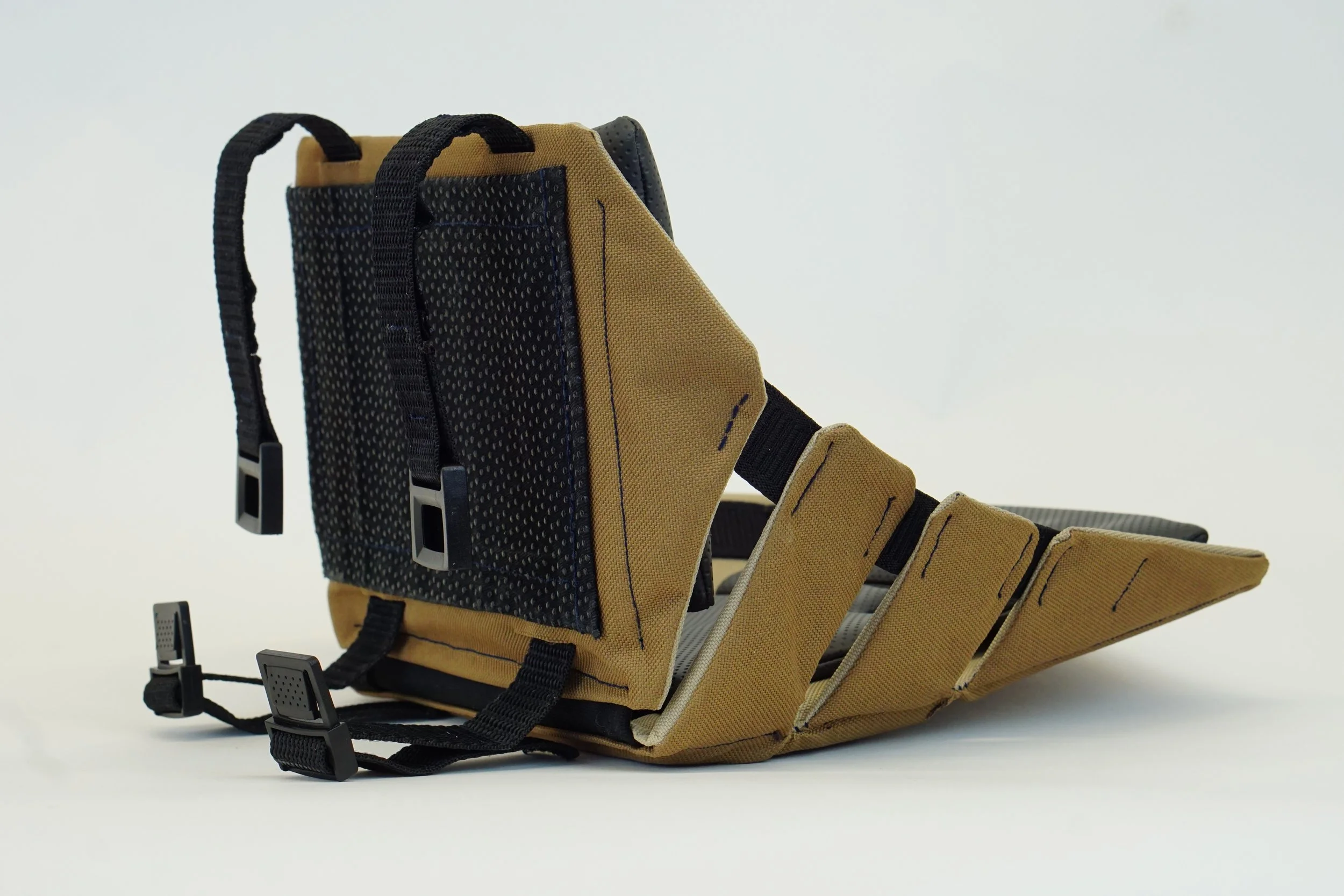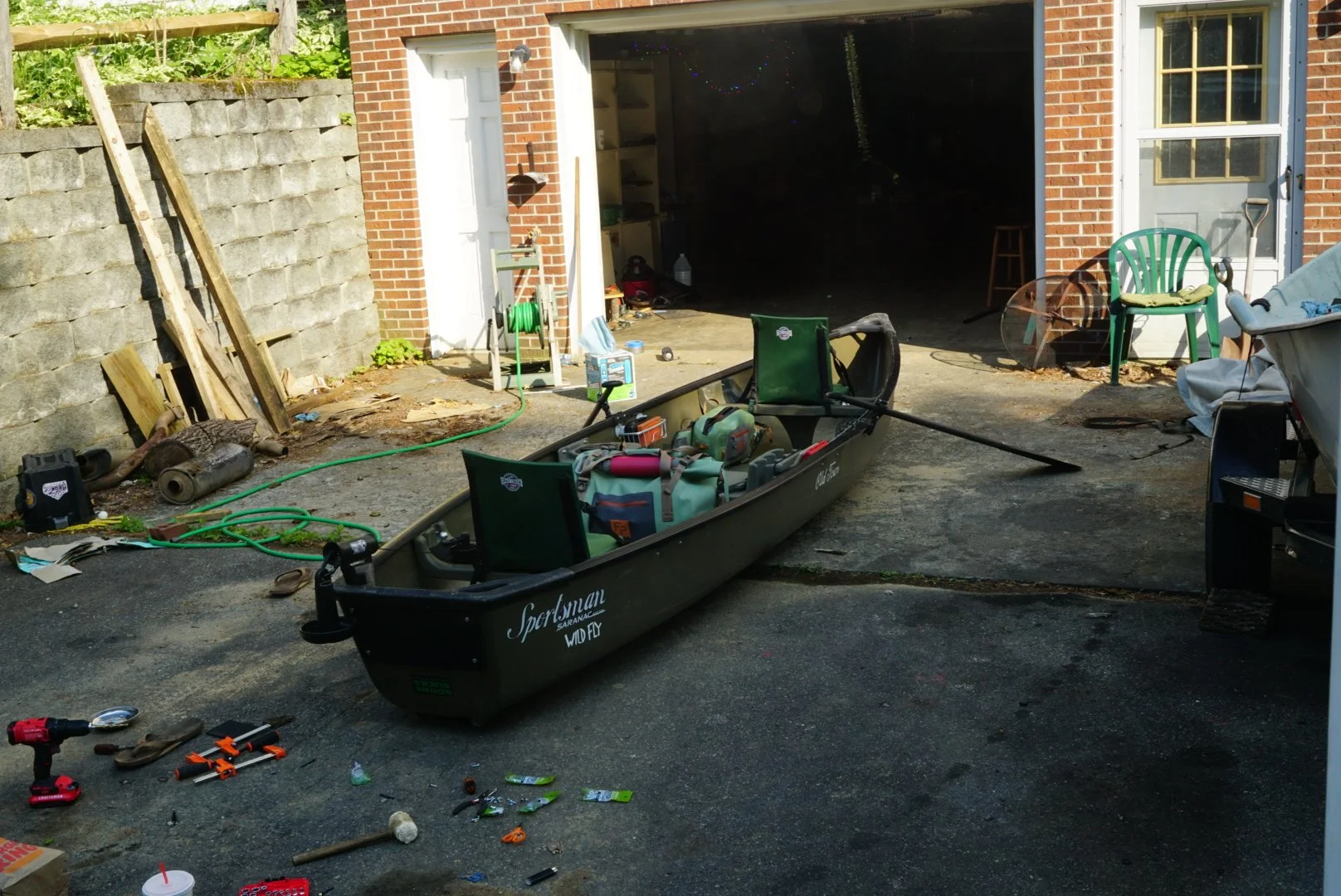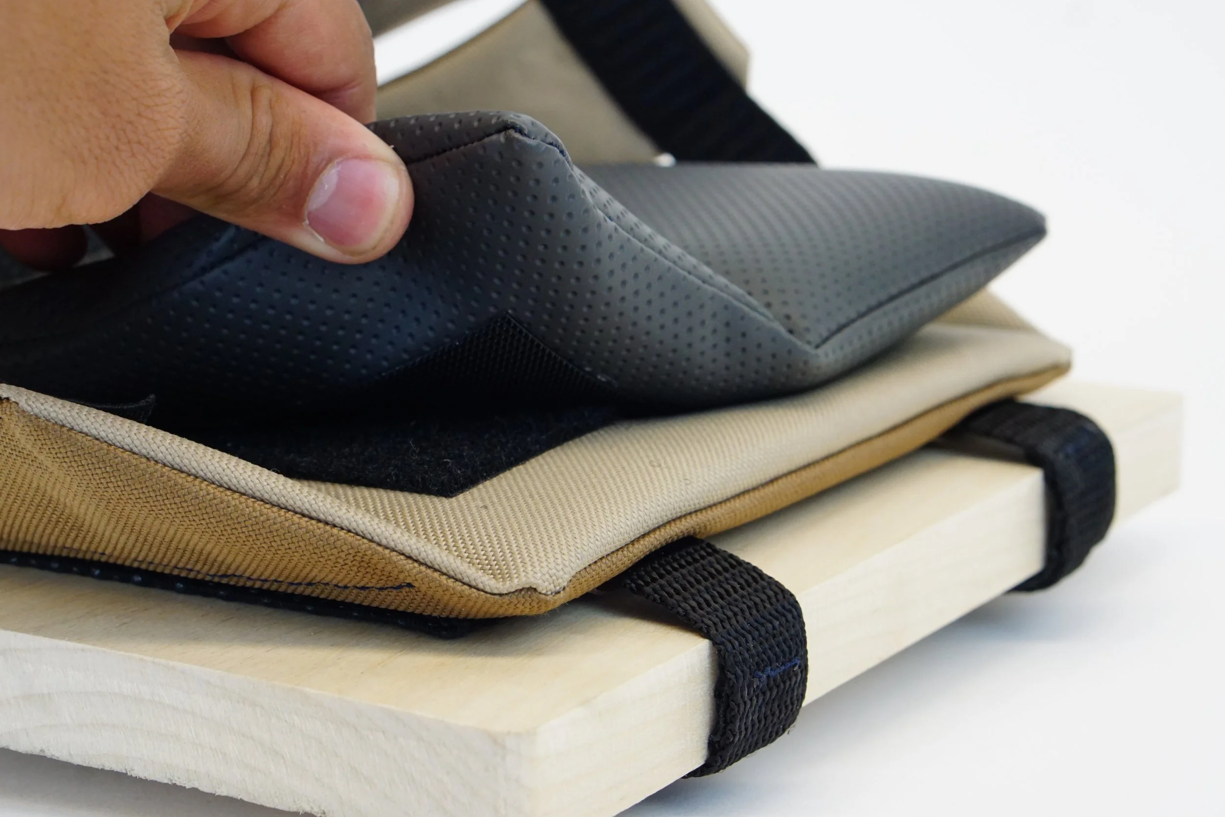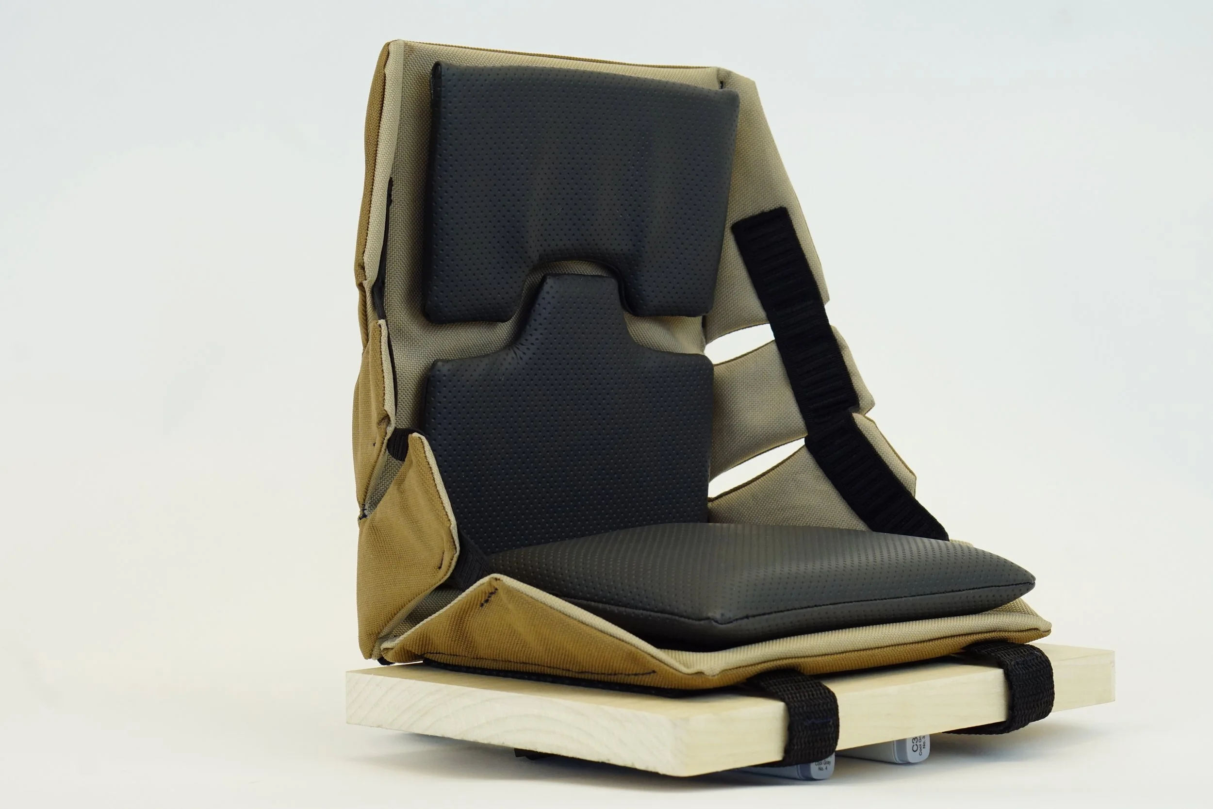 A technical canoe chair constructed from multiple panels of waterproof nylon canvas backed with PVC.